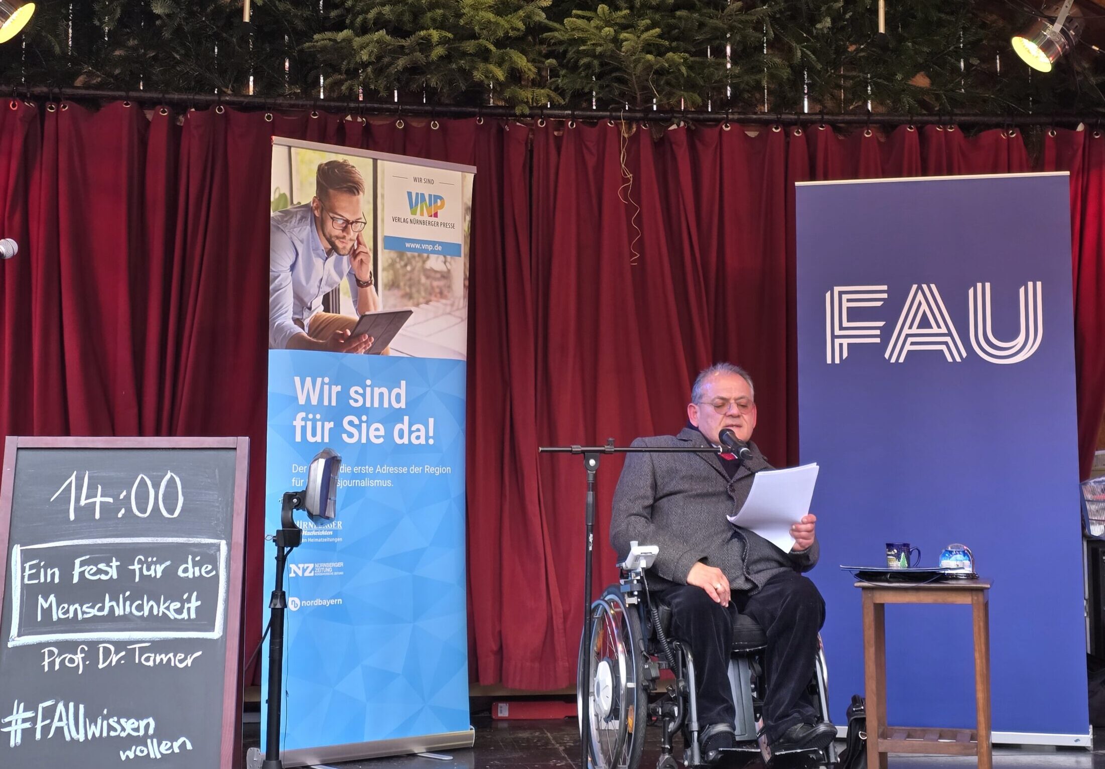 Im Rahmen der Veranstaltungsreihe #FAUwissenwollen stellen Wissenschaftlerinnen und Wissenschaftler ihre aktuellen Projekte und Forschungsergebnisse allgemein verständlich vor und gehen auf Fragen aus dem Publikum ein. Am 5.12.2025 hielt der Gründungsdirektor des BaFID auf der Erlanger Waldweihnacht Bühne einen Vortrag mit dem Titel „Ein Fest für die Menschlichkeit – Weihnachten interreligiös und unabhängig vom Glauben gedacht“.