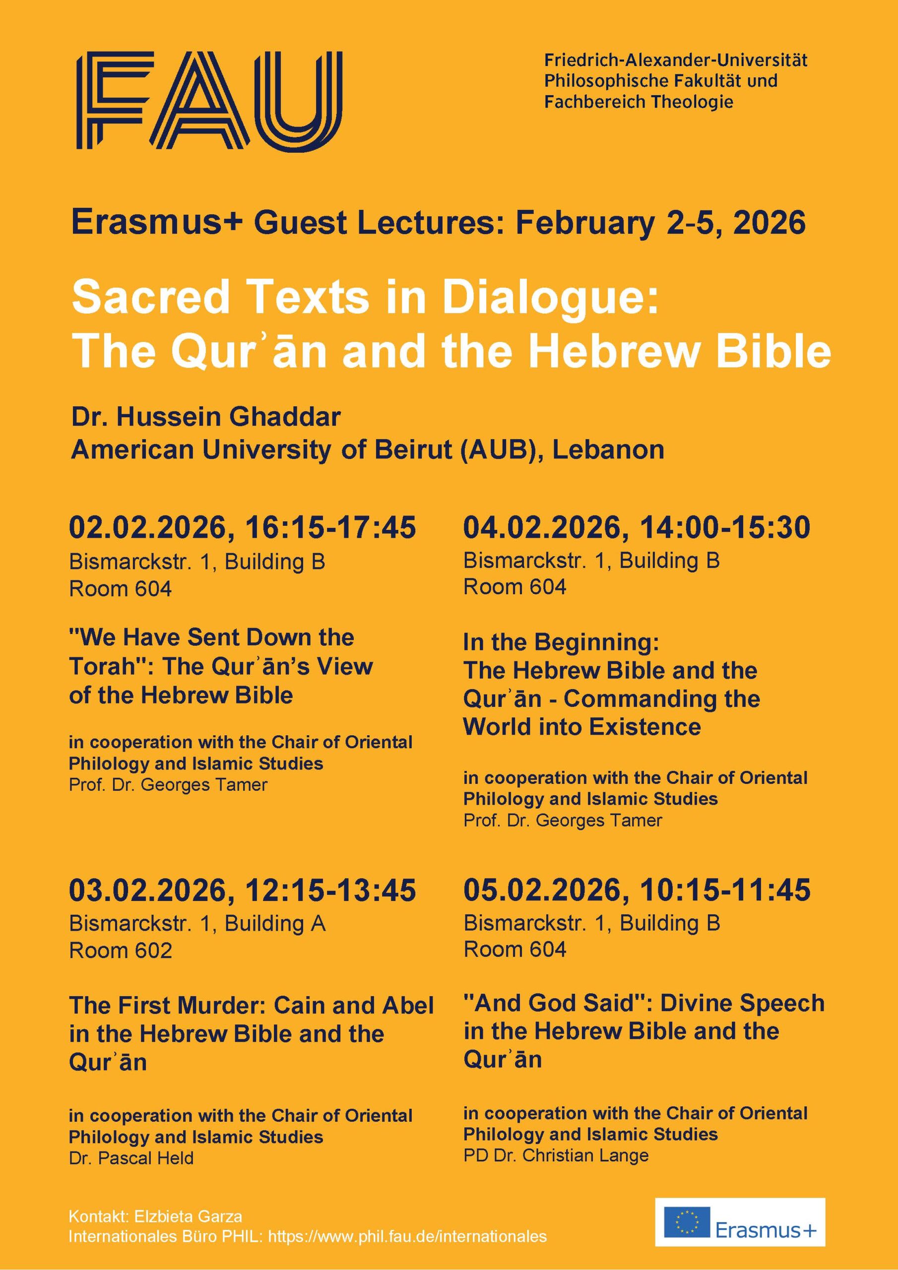 From 2 to 5 February 2026, several events will take place at FAU Erlangen as part of the Erasmus+ programme on the topic of “Sacred Texts in Dialogue: The Qur’an and the Hebrew Bible”.